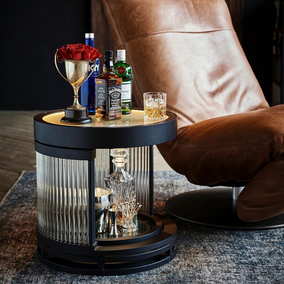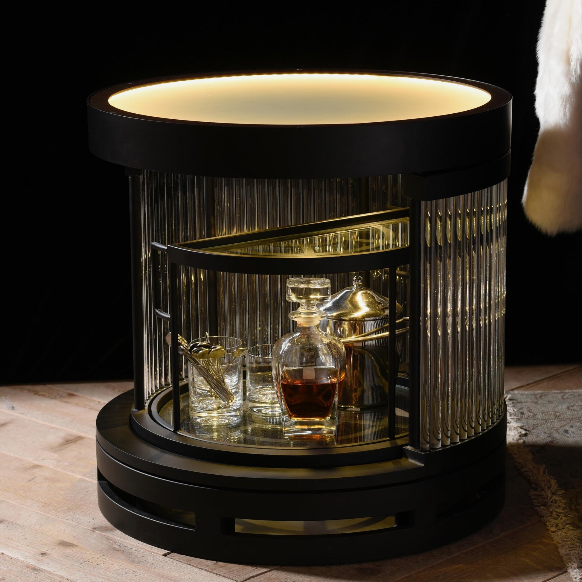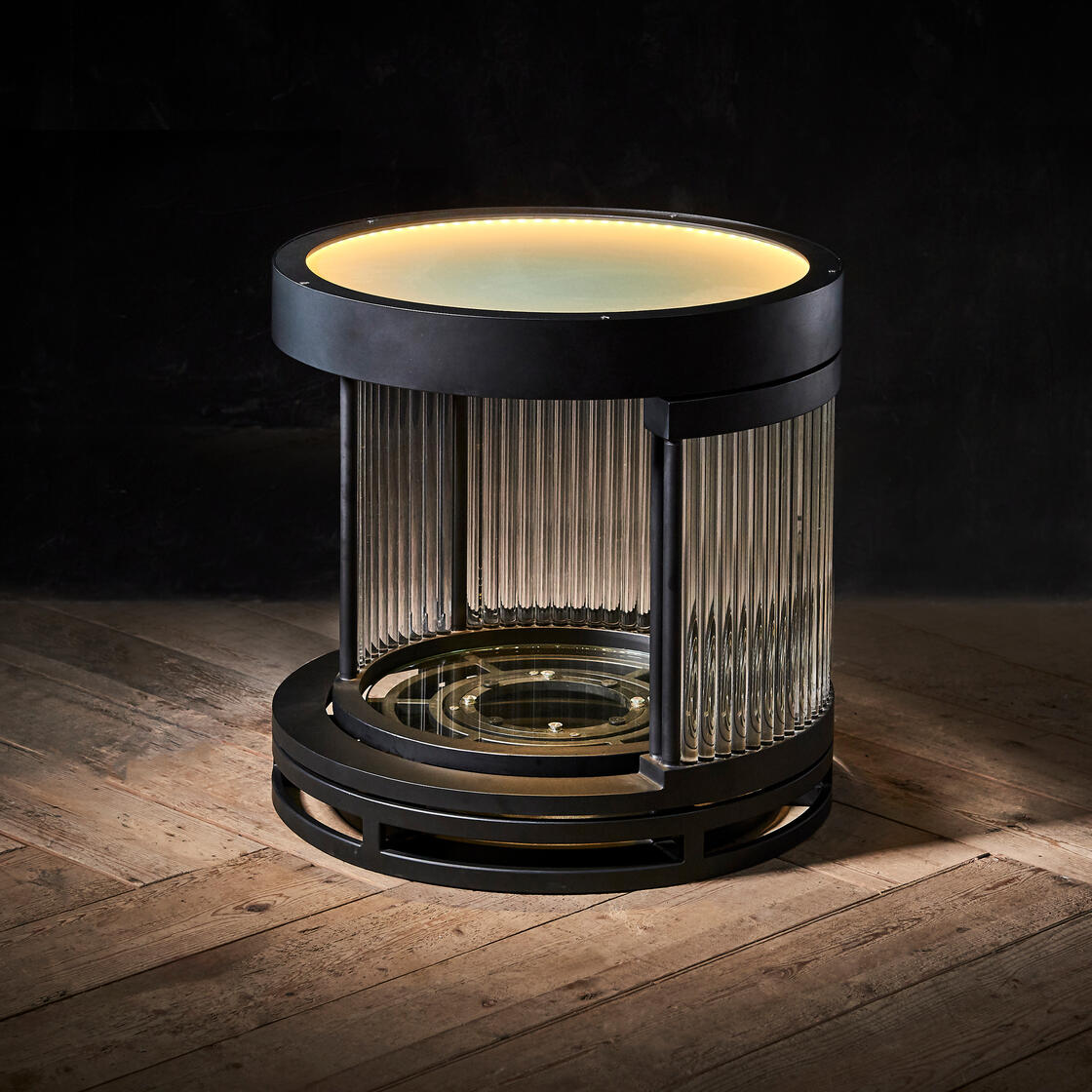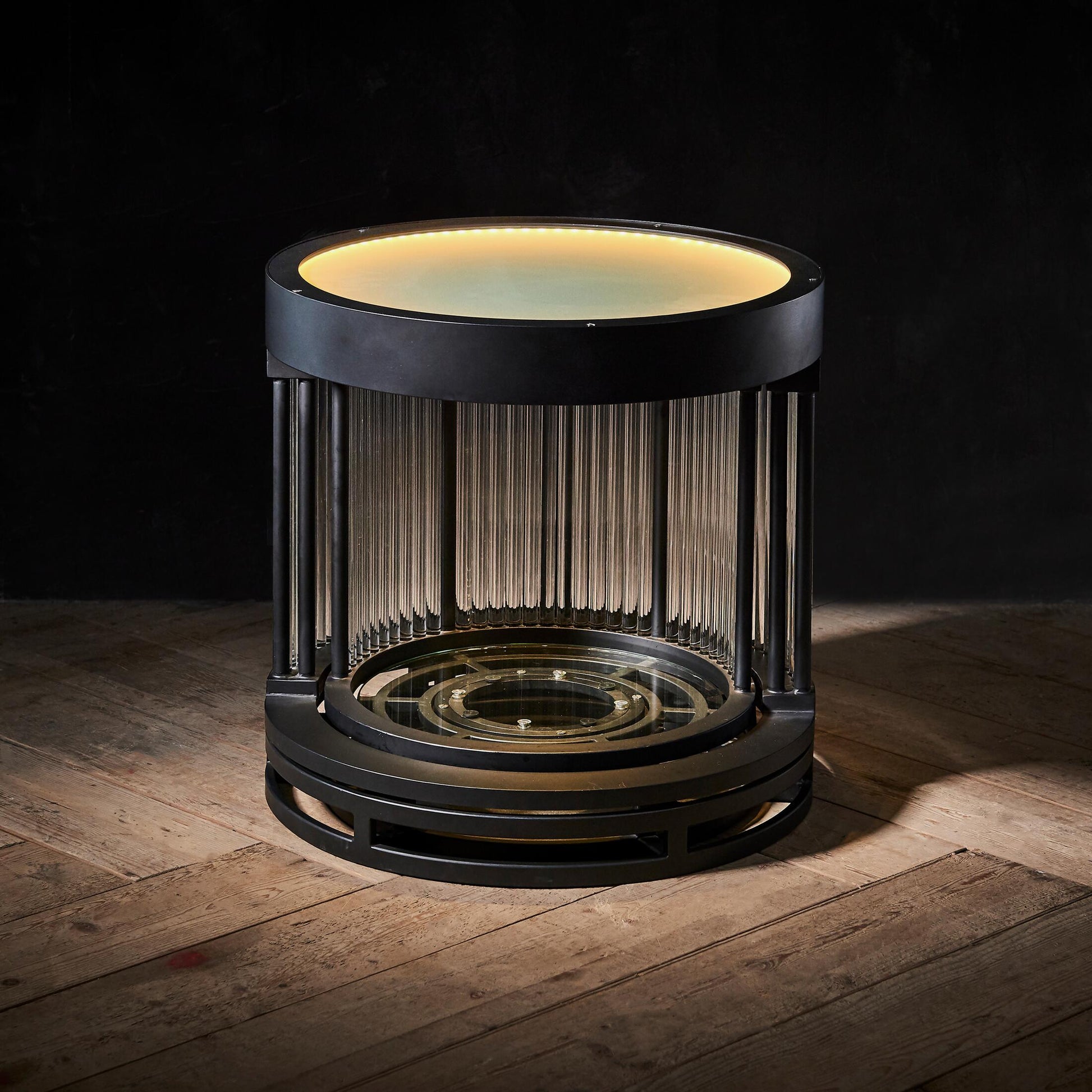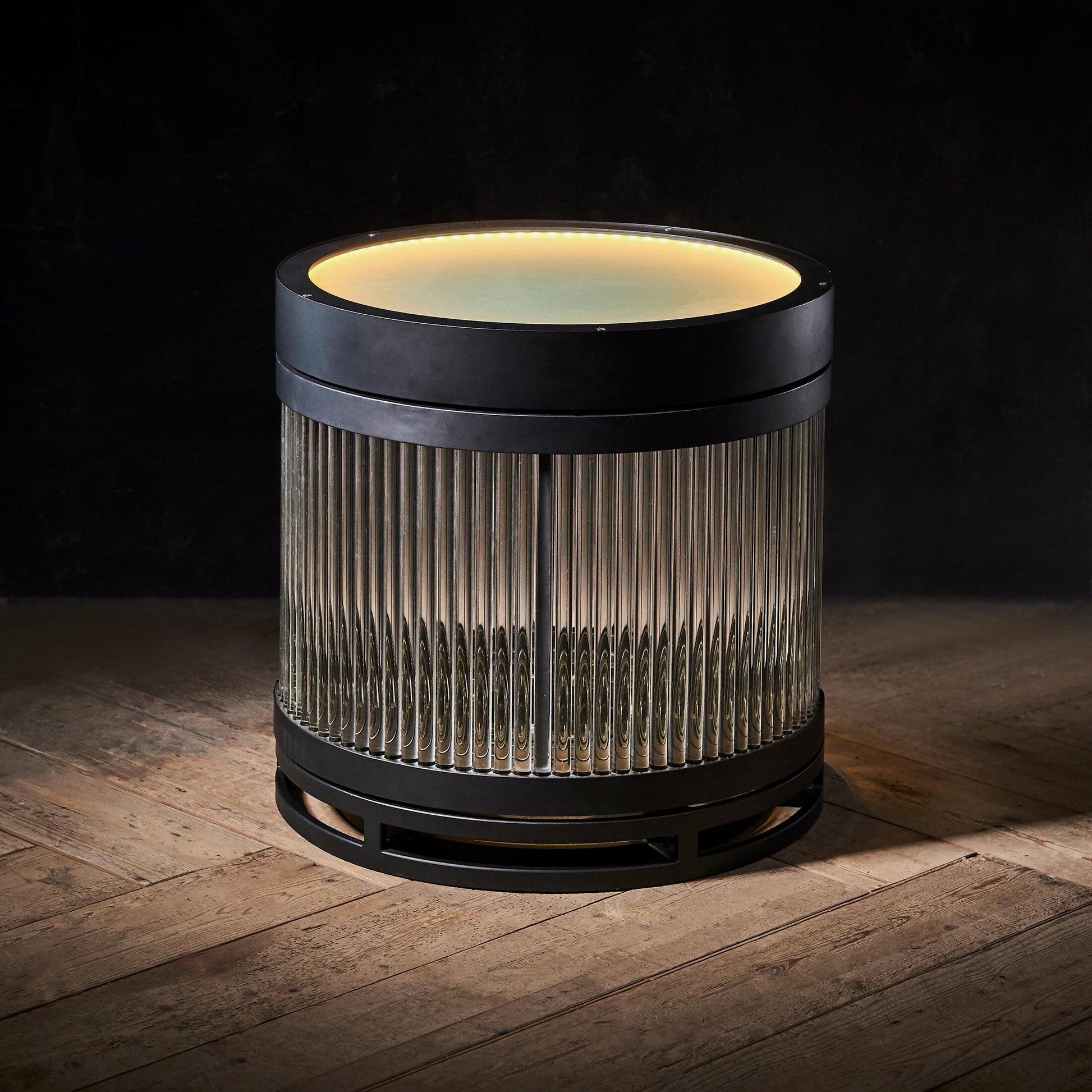 A smaller version of our Bio Hazard bar cabinet, serving as a side table. The sardonically named Bio Hazard is its own warning label, but this beautiful glowing capsule of handcrafted glass rods is tempting nonetheless. Held in a black frame, with LED lighting built into the top, the round sliding doors reveal a protected core, to hold bottles of your guests' favourite poison.