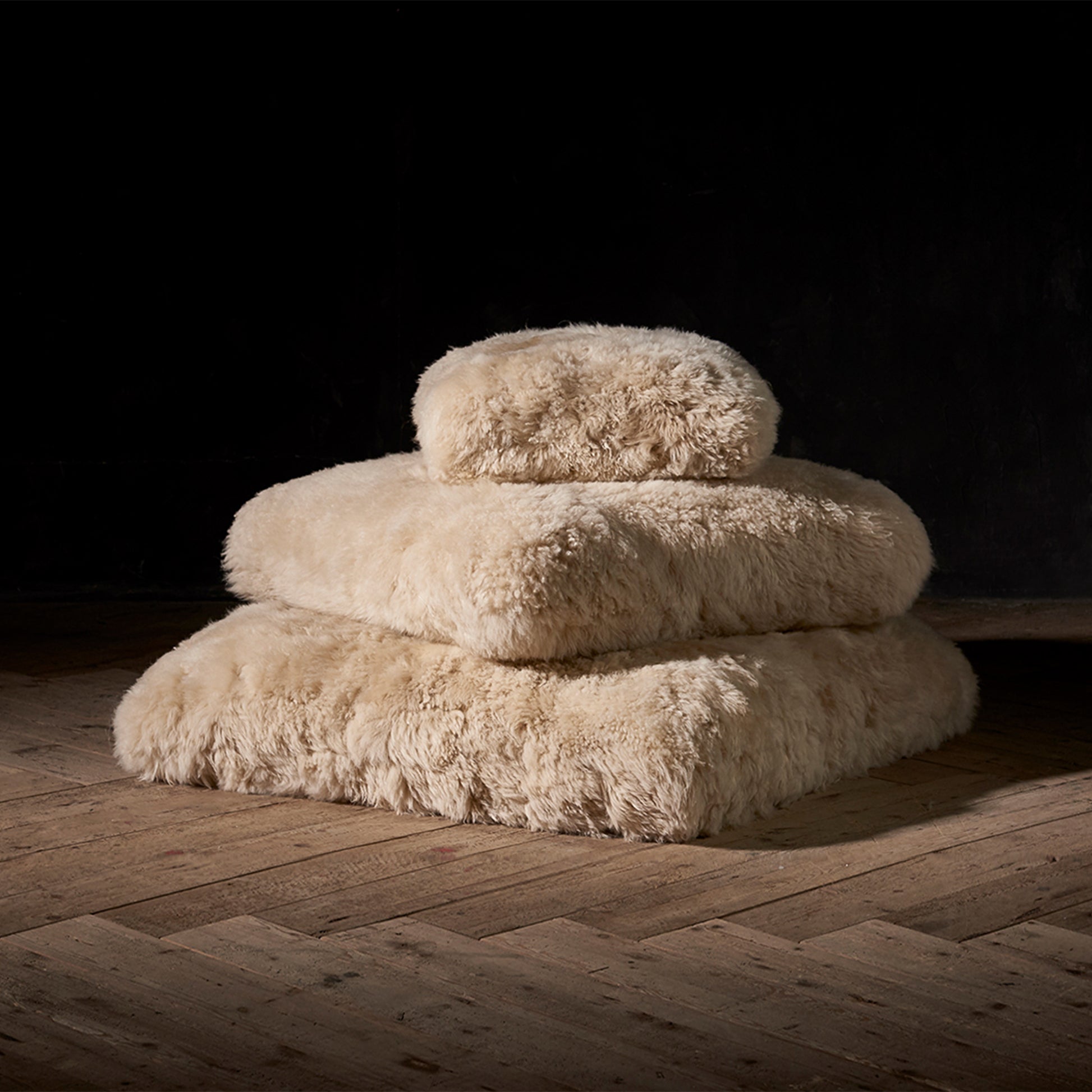 Available in 3 sizes, these incredibly tactile floor cushions are upholstered in premium New Zealand sheepskin, backed in a black woven fabric and filled with premium foam and fibre for a comfortable, supportive sit. The name Caravaha is taken from the Punjabi for shepherd. Yeti Beige is a shaggy, long-haired sheepskin finish.