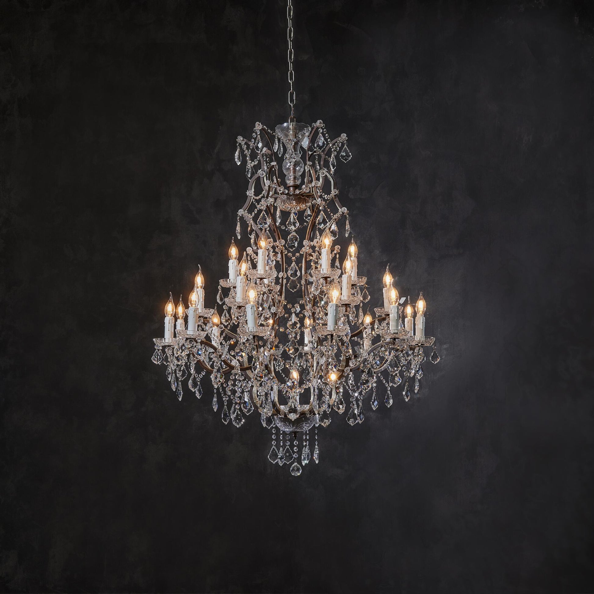 The Crystal chandelier is inspired by the elaborate designs of late Georgian era chandeliers. This handcrafted range features many hallmarks of Georgian design including large crystal baluster centrepieces, precision cut glass crystals, candle lights and corresponding bobeche dishes originally used to collect candlewax. These elaborate and romantic features are starkly contrasted with the rustic aged metal patina of our proprietary Antique Rust finish to create its uniquely authentic and Timothy Oulton look.