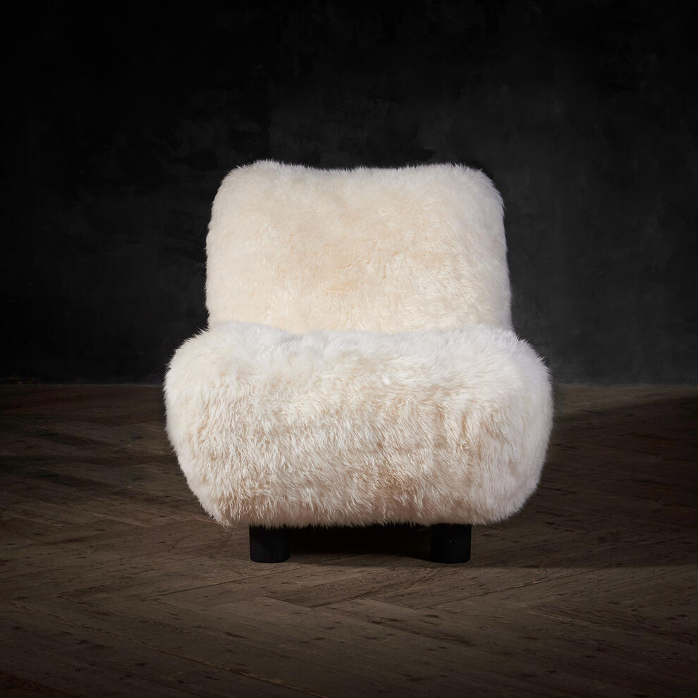 The bold curves of the Konichin chair invite a generous and relaxed slouching. Its saddle like base, along with its name, evoke the shepherding horsecraft of the Mongolian steppe, swathed in luxuriant New Zealand sheepskin that has been selected by hand for its extraordinary softness and sink-in comfort. The high seat back has a relaxed slouch to encourage long, lazy lounging.