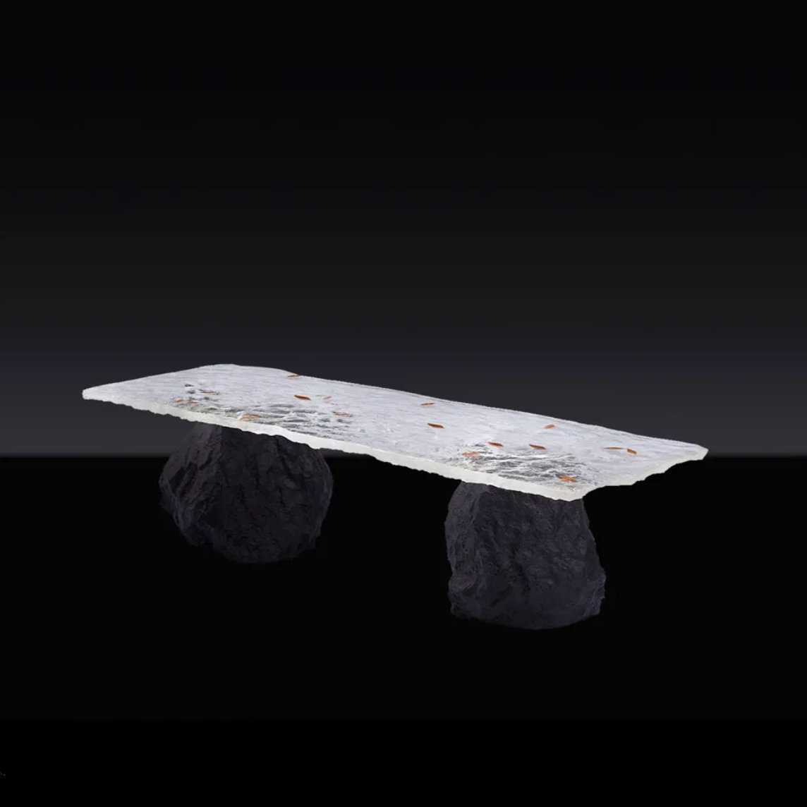 This dining table is supported by stones and adorned with a transparent crystal tabletop, symbolizing the masculine strength of the stones, which sustains the gentle and tender surface of the water, akin to a woman. Together, they form a symbiotic relationship in art, where their fusion is both commonplace and unexpectedly surprising, embodying the cultural essence of "art deriving from life, surpassing life." The work seems to embody the Zen concept of "emptiness and tranquillity."