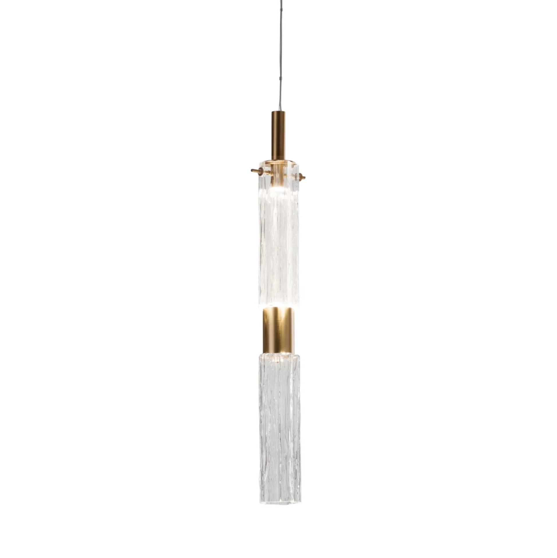 Reinterprets the glamour of Art Deco style with modern flair. Its cylindrical structure crafted from brass 24ct gold plated is adorned with two cylindrical Murano glass elements, of which one serves as diffuser for the one LED bulb within, while the bottom one reflects the light to add a sparkle to any room.