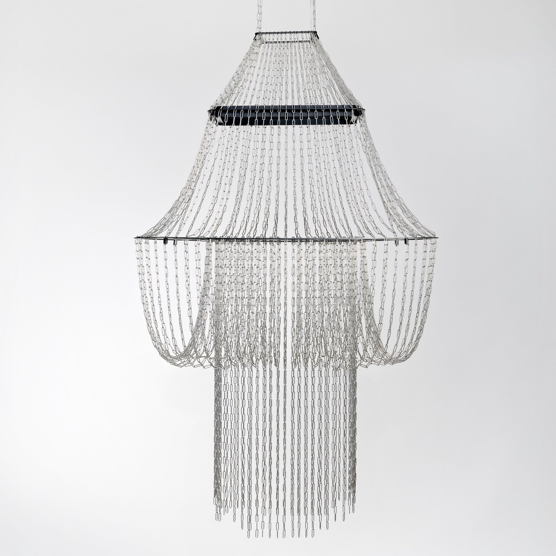 Lamp C reinvents the traditional chandelier, sculpting light onto its metal chains for a sparkling and fascinating effect. "The void shapes the volume: this monumental pendant plays on the transparency and movement of the chains to project an airy and vibrant light, enhancing each space."