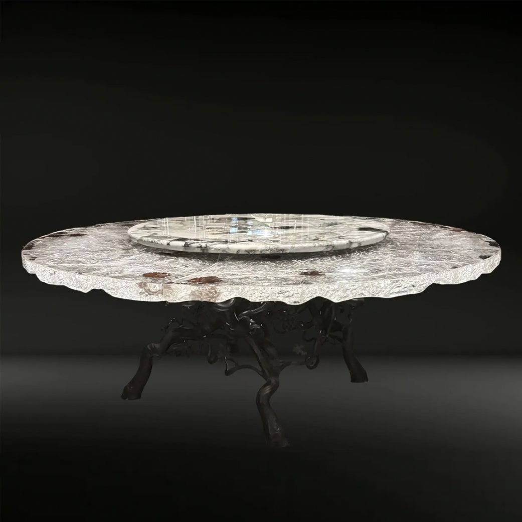 The Classic Wine Cellar: A Timeless Fusion of Centuries-Old Vines Experience the rich, aged aroma of time with our Wine Cellar Home Collection, where traditional Spanish craftsmanship meets modern luxury. Inspired by Spain's oldest centenarian vines, this collection captures the natural texture and warm ambiance of the vineyard. The Wine Cellar round dining table draws inspiration from the shape of century-old Spanish grapevines. Four vine tendrils rise, twist, and intertwine to form the gracefully artistic table legs. Handcrafted by artisans, each detail pays homage to the history of time. The tabletop features four leaf-shaped glacier crystal segments, embedded with real grape leaves. Accompanied by a cool jade marble turntable, the design harmonizes with the vine-inspired legs, offering a refined exploration of classic wine cellar elements and a poetic expression of organic natural art. This version maintains the essence of the original while emphasizing the luxury and craftsmanship of the product.