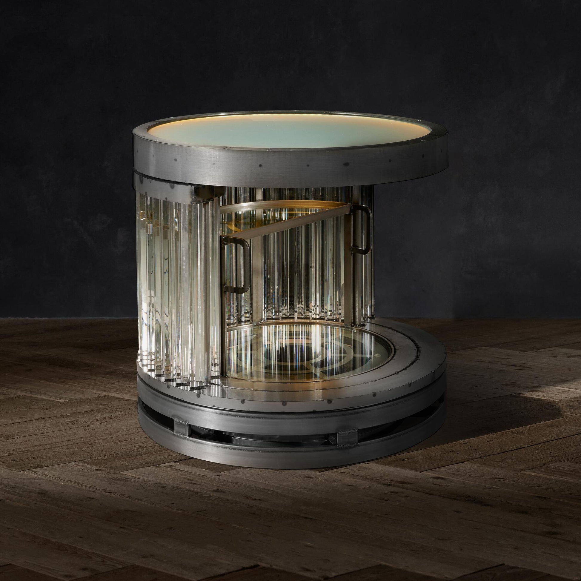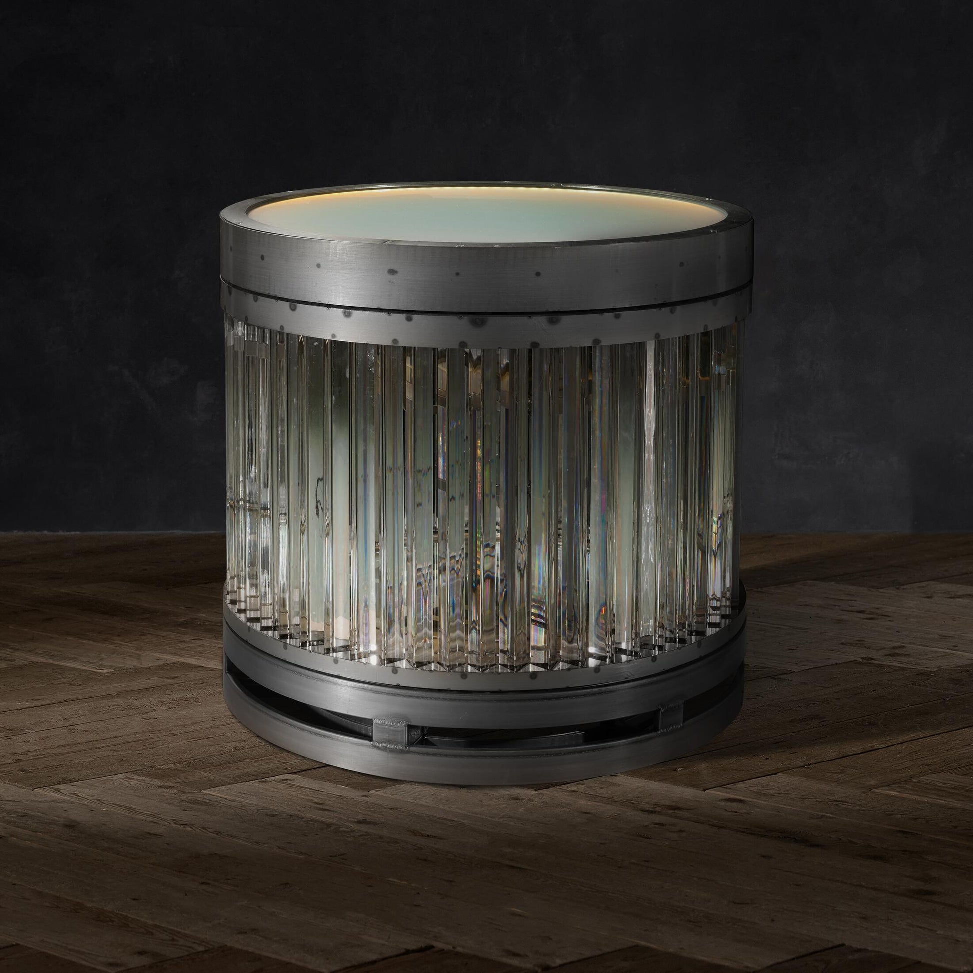 Swirl your senses with the show-stopping Rex collection. Strongly directed by Art Deco influences, Rex recaptures the magic and romance of glamour's golden age. The collection shares its name with the historic Rex cinema in England; a 1930s Art Deco gem boasting a beautiful auditorium with dramatic lighting. Saved from dereliction by a local entrepreneur, the cinema was restored to its former glory in 2004. The Rex Biohazard bar cabinet juxtaposes a natural metal frame with glowing prisms of optical grade glass, refracting the light in a perpetual dance of shimmer and sparkle. Vintage glamour, recast for today.