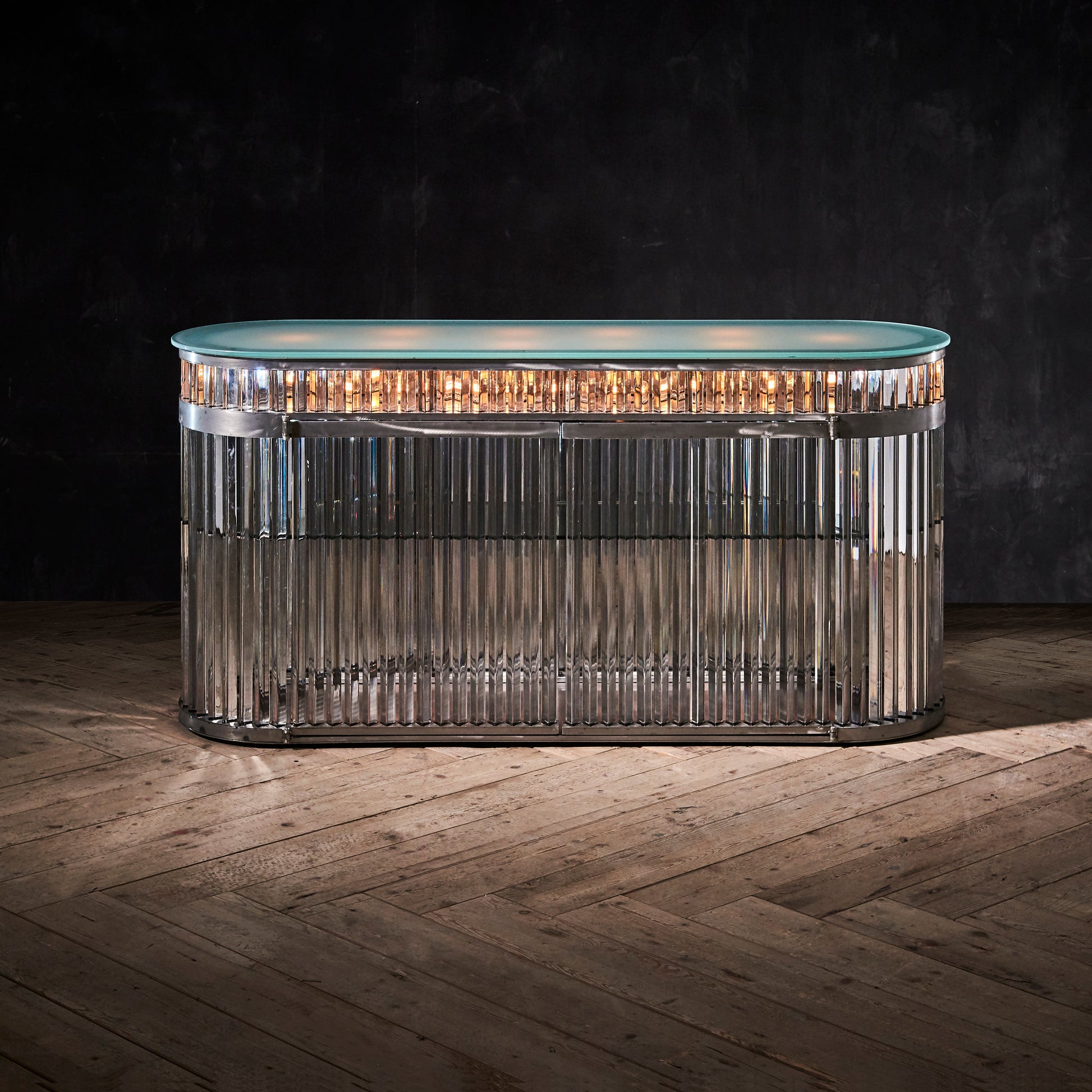 Swirl your senses with the show-stopping Rex collection. Strongly directed by Art Deco influences, Rex recaptures the magic and romance of glamour's golden age. The collection is inspired by the historic Rex cinema in England; a 1930s Art Deco gem boasting a beautiful auditorium with dramatic lighting. Saved from dereliction by a local entrepreneur, the cinema was restored to its former glory in 2004. The Rex sideboard juxtaposes its raw iron frame with glowing prisms of optical grade glass, refracting the light in a perpetual dance of shimmer and sparkle. Vintage glamour, recast for today.