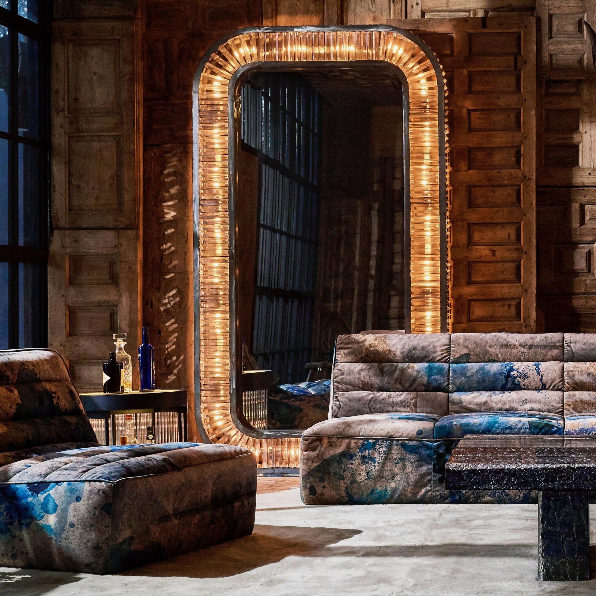 Swirl your senses with the show-stopping Rex collection. Strongly directed by Art Deco influences, Rex recaptures the magic and romance of glamour's golden age.The collection is inspired by the historic Rex cinema in England; a 1930s Art Deco gem boasting a beautiful auditorium with dramatic lighting. Saved from dereliction by a local entrepreneur, the cinema was restored to its former glory in 2004. The Rex tall mirror juxtaposes its raw iron frame with glowing prisms of optical grade glass, refracting the light in a perpetual dance of shimmer and sparkle. 361 prisms are assembled by hand on the 2.4m high mirror. Vintage glamour, recast for today.