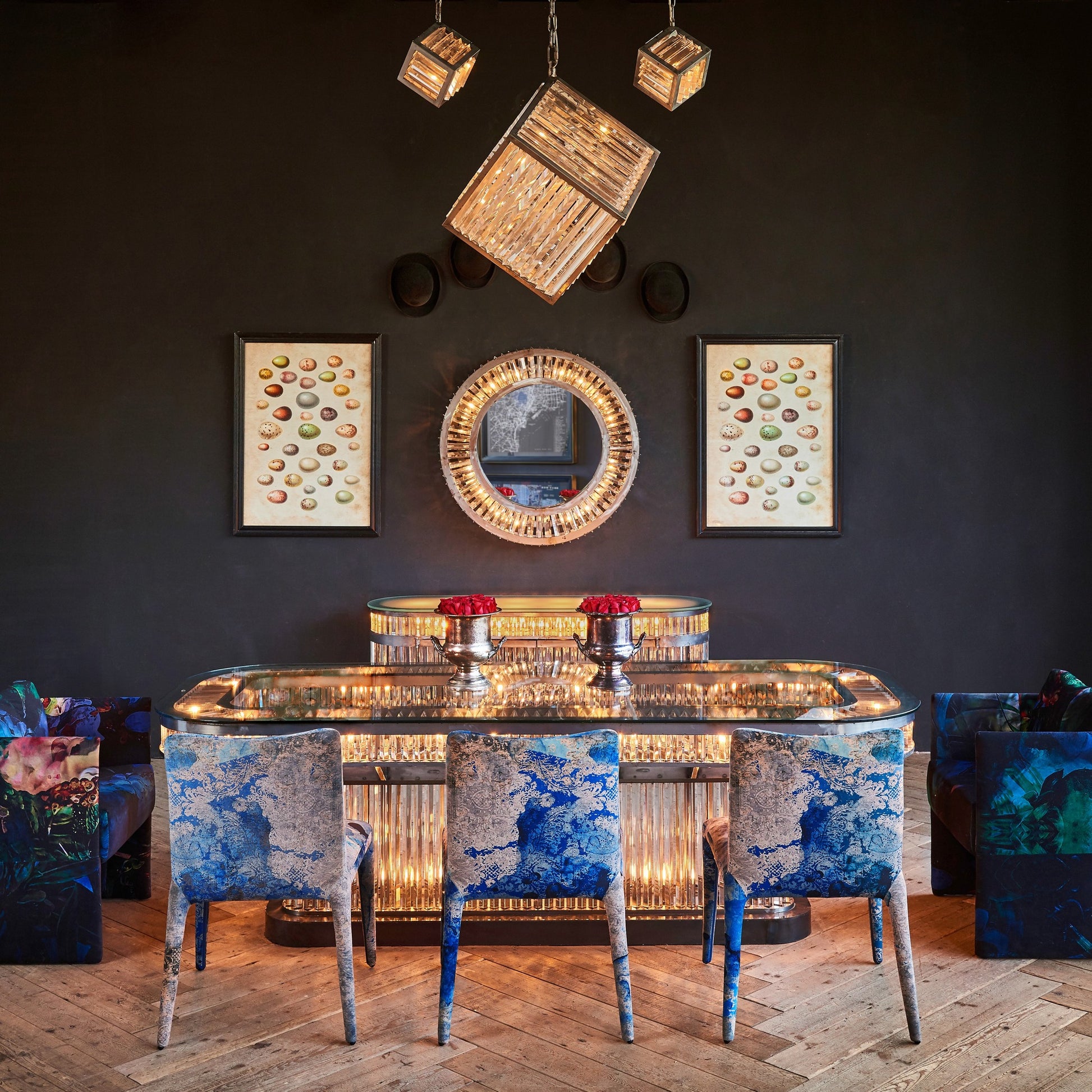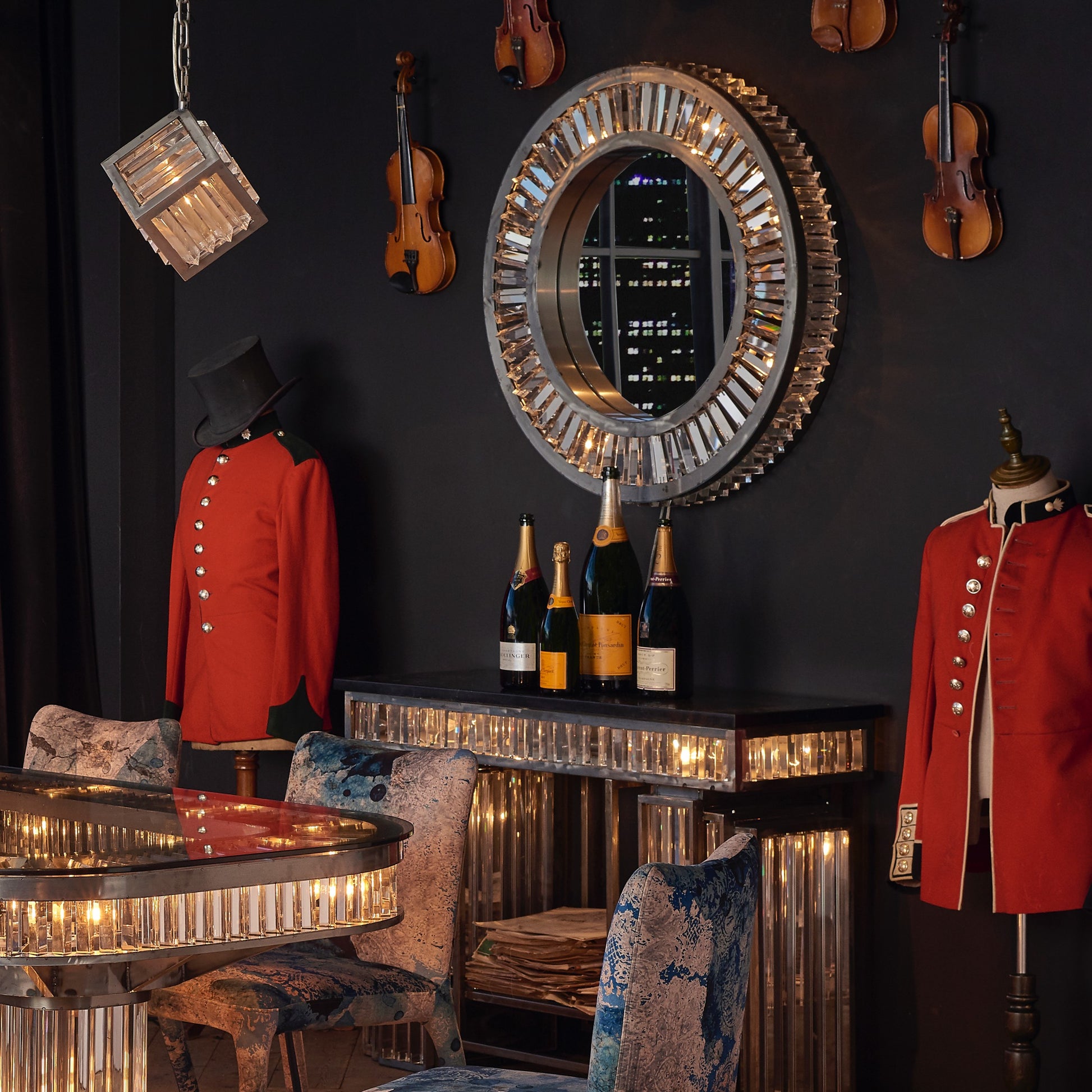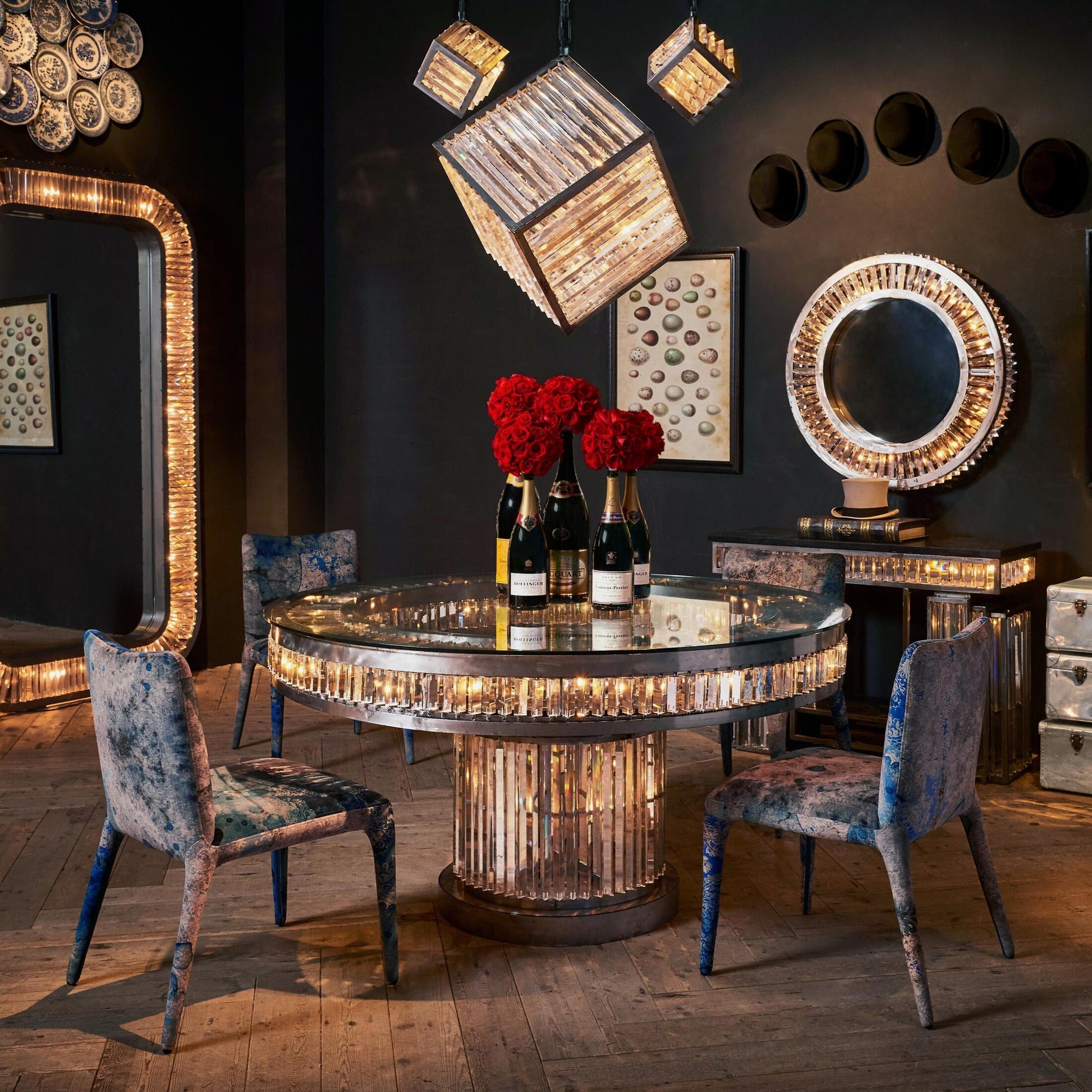 Swirl your senses with the show-stopping Rex collection. Strongly directed by Art Deco influences, Rex recaptures the magic and romance of glamour's golden age.The collection is inspired by the historic Rex cinema in England; a 1930s Art Deco gem boasting a beautiful auditorium with dramatic lighting. Saved from dereliction by a local entrepreneur, the cinema was restored to its former glory in 2004. The Rex mirror juxtaposes its raw iron frame with glowing prisms of optical grade glass, refracting the light in a perpetual dance of shimmer and sparkle. Vintage glamour, recast for today.