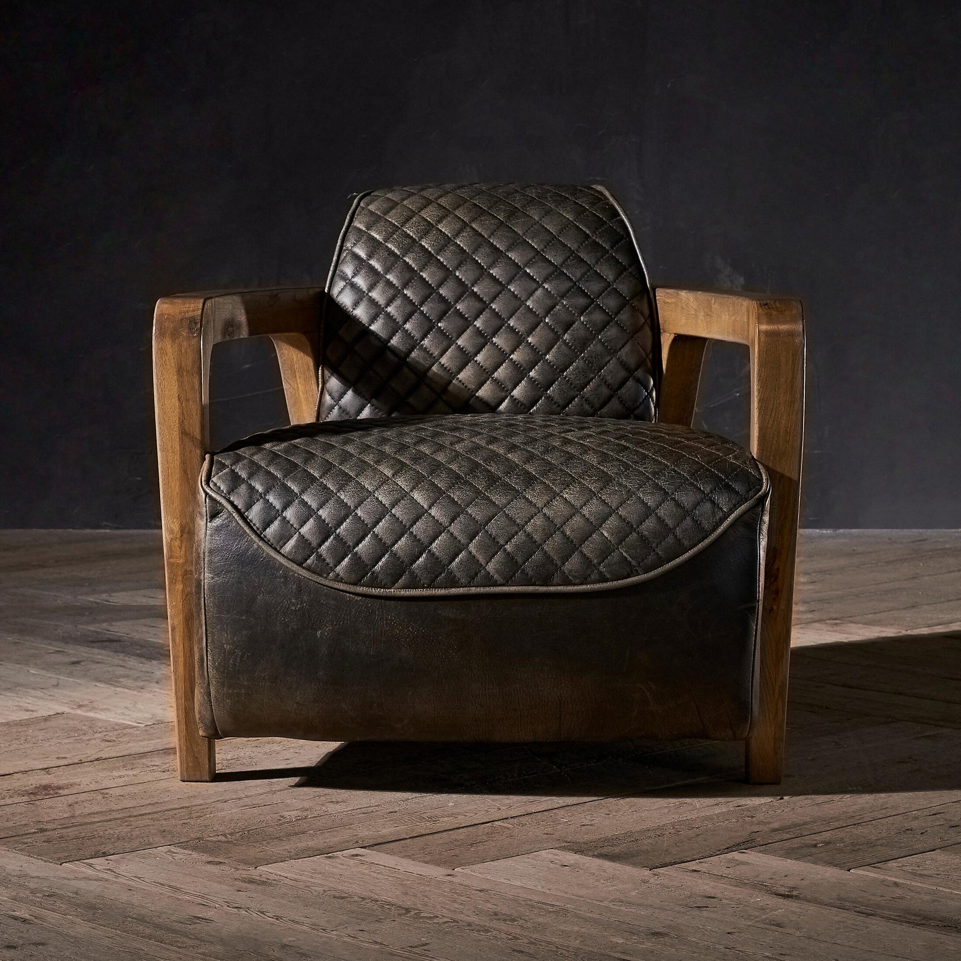 Adapted from our celebrated Aviator Tomcat chair, the Wildcat chair takes a walk into more wild terrain, swapping the Tomcat's industrial persona for a more natural and relaxed temperament. Rustic Weathered Oak arms give a warm, earthy feel, while the sumptuously soft leather has been quilted instead of ribbed, reminiscent of English country jackets and gentrified rural living. Modern meets casual, with a rugged edge.