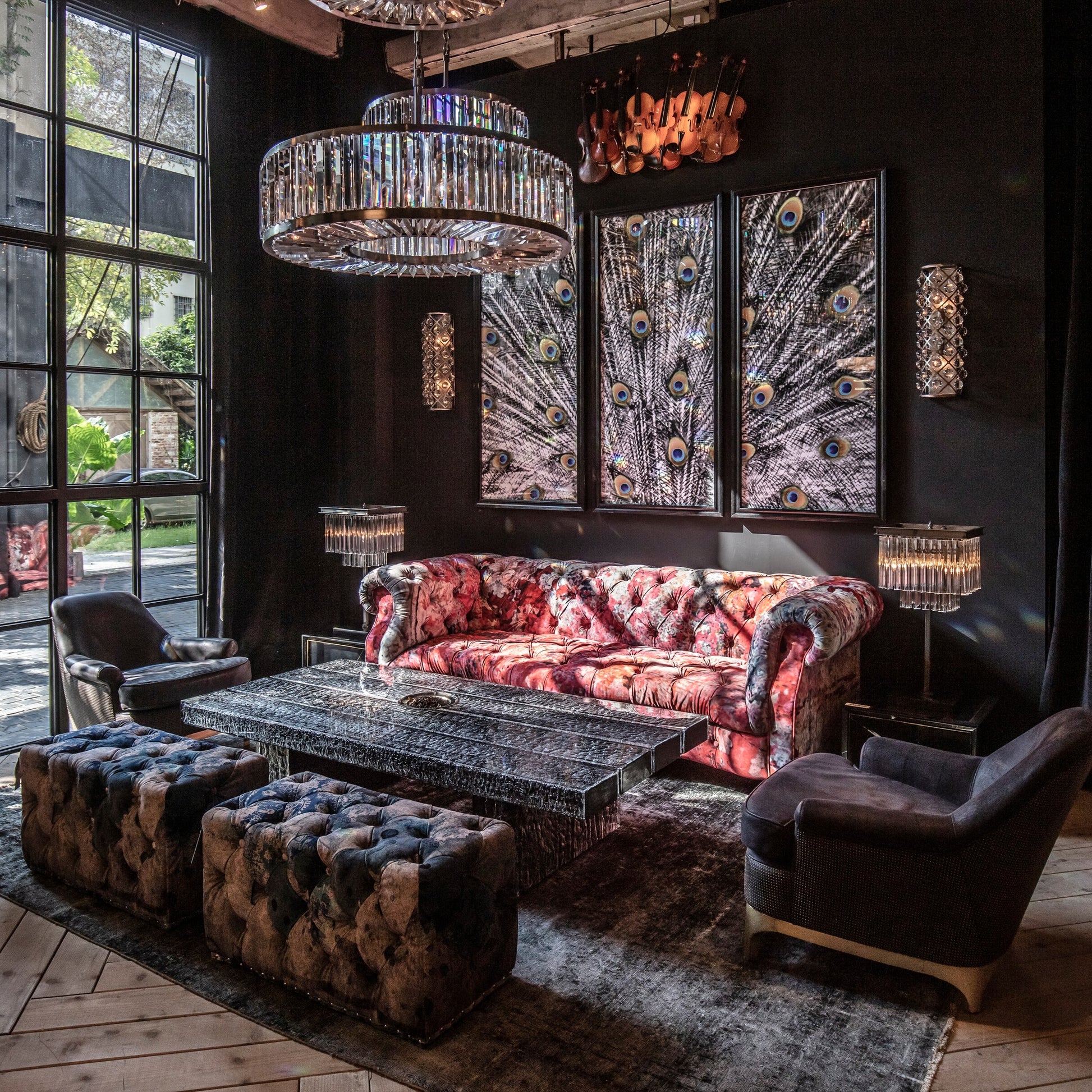 The Zig Zag sconce features delicate spheres of hand-polished glass suspended from an intricate iron skeleton. Like a galaxy of suspended planets, each sphere bounces the reflections and refractions of the others to create a kaleidoscope of patterns.